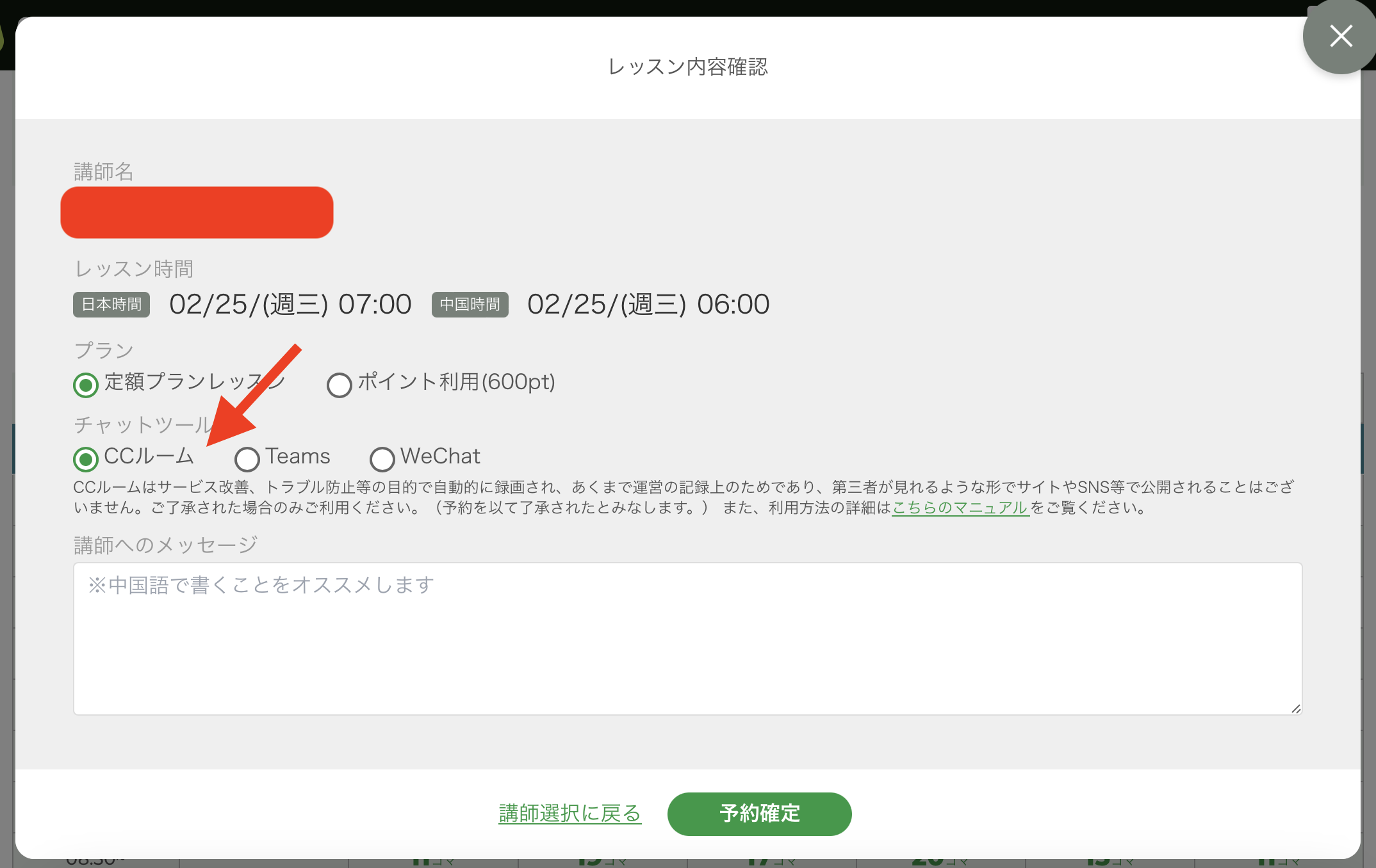 受講したい時間・先生を予約すると、こんな「レッスン内容確認」が出てきます。