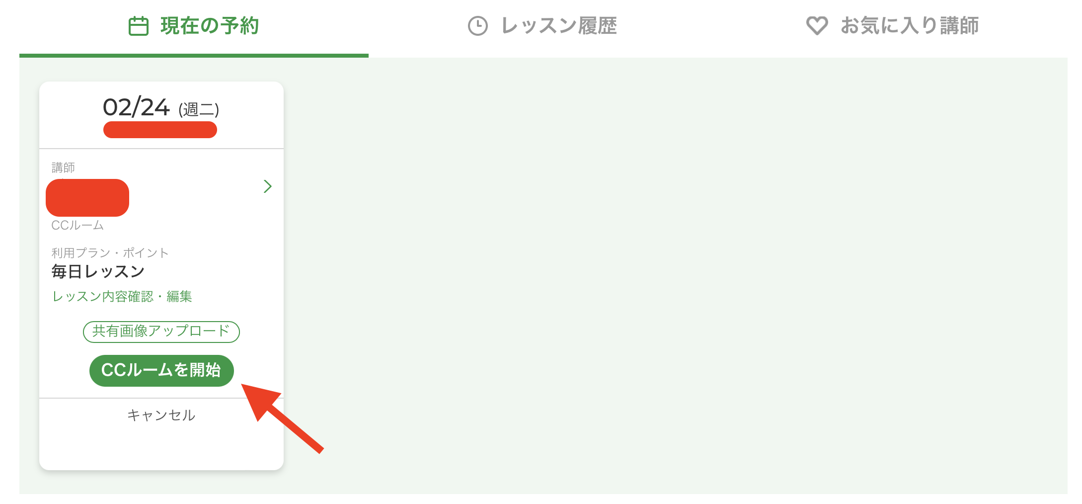 レッスン開始時間になったら「CCルームを開始」をクリックするだけ!